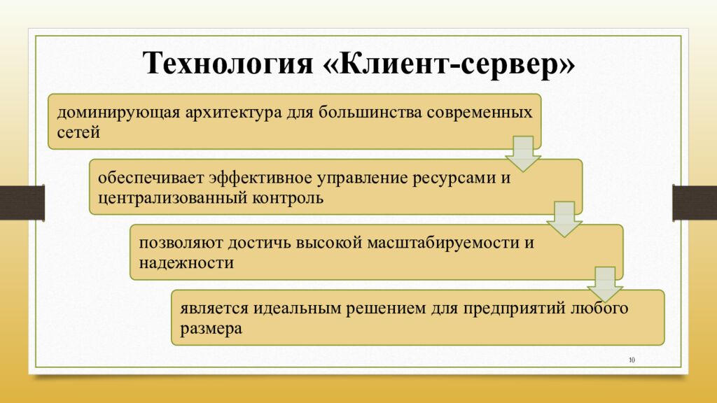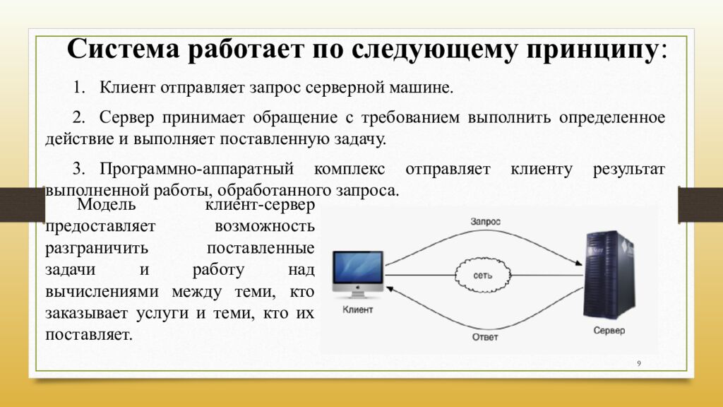 1. Клиент отправляет запрос серверной машине. 2. Сервер принимает обращение с требованием выполнить определенное действие и выполняет поставленную задачу. 3. Программно-аппаратный комплекс отправляет клиенту результат выполненной работы, обработанного запроса. 9 Модель клиент-сервер предоставляет возможность разграничить поставленные задачи и работу над вычислениями между теми, кто заказывает услуги и теми, кто их поставляет.