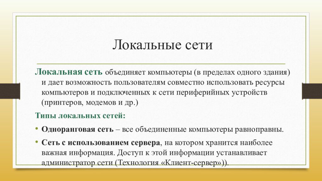 Локальная сеть объединяет компьютеры (в пределах одного здания) и дает возможность пользователям совместно использовать ресурсы компьютеров и подключенных к сети периферийных устройств (принтеров, модемов и др.) Типы локальных сетей: Одноранговая сеть – все объединенные компьютеры равноправны. Сеть с использованием сервера, на котором хранится наиболее важная информация. Доступ к этой информации устанавливает администратор сети (Технология «Клиент-сервер»)).