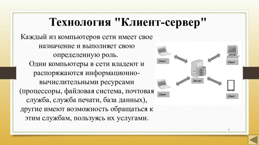 6 Каждый из компьютеров сети имеет свое назначение и выполняет свою определенную роль. Одни компьютеры в сети владеют и распоряжаются информационно-вычислительными ресурсами (процессоры, файловая система, почтовая служба, служба печати, база данных), другие имеют возможность обращаться к этим службам, пользуясь их услугами.
