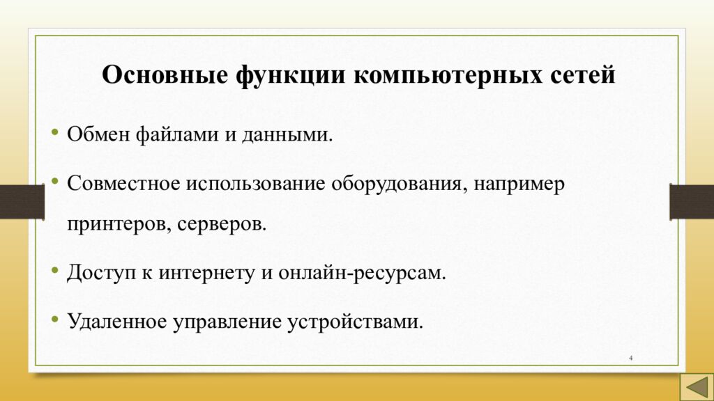Обмен файлами и данными. Совместное использование оборудования, например принтеров, серверов. Доступ к интернету и онлайн-ресурсам. Удаленное управление устройствами. 4