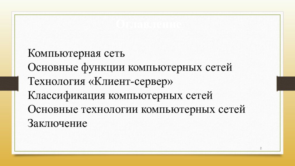 2 Оглавление Компьютерная сеть Основные функции компьютерных сетей Технология «Клиент-сервер» Классификация компьютерных сетей Основные технологии компьютерных сетей Заключение