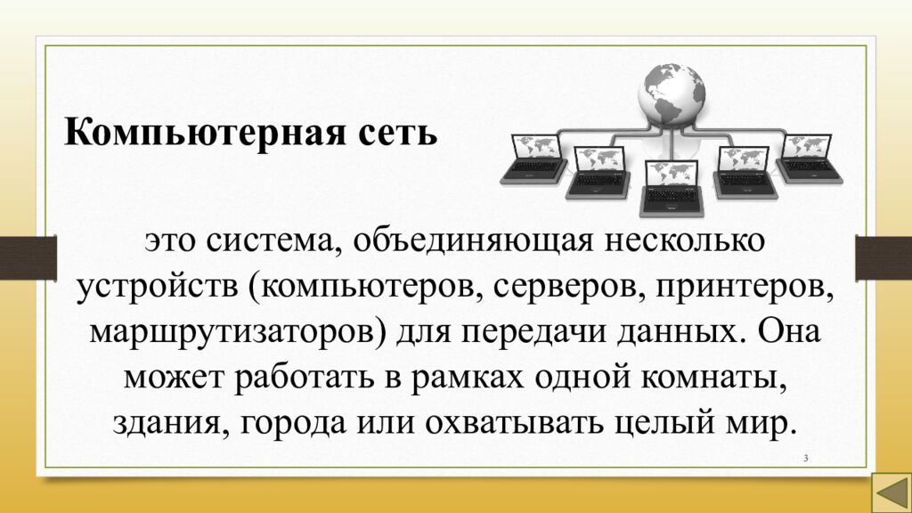 3 это система, объединяющая несколько устройств (компьютеров, серверов, принтеров, маршрутизаторов) для передачи данных. Она может работать в рамках одной комнаты, здания, города или охватывать целый мир.