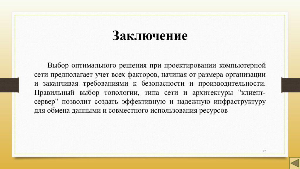 Выбор оптимального решения при проектировании компьютерной сети предполагает учет всех факторов, начиная от размера организации и заканчивая требованиями к безопасности и производительности. Правильный выбор топологии, типа сети и архитектуры "клиент-сервер" позволит создать эффективную и надежную инфраструктуру для обмена данными и совместного использования ресурсов 17