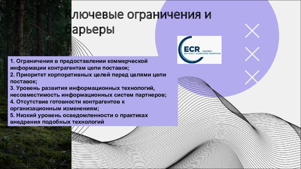 1. Ограничения в предоставлении коммерческой информации контрагентам цепи поставок; 2. Приоритет корпоративных целей перед целями цепи поставок; 3. Уровень развития информационных технологий, несовместимость информационных систем партнеров; 4. Отсутствие готовности контрагентов к организационным изменениям; 5. Низкий уровень осведомленности о практиках внедрения подобных технологий