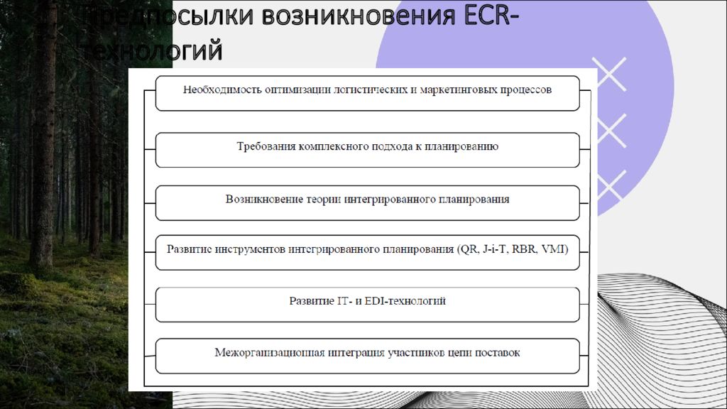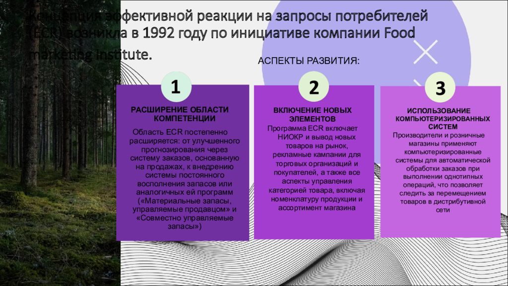 РАСШИРЕНИЕ ОБЛАСТИ КОМПЕТЕНЦИИ Область ECR постепенно расширяется: от улучшенного прогнозирования через систему заказов, основанную на продажах, к внедрению системы постоянного восполнения запасов или аналогичных ей программ («Материальные запасы, управляемые продавцом» и «Совместно управляемые запасы») 1 ВКЛЮЧЕНИЕ НОВЫХ ЭЛЕМЕНТОВ Программа ECR включает НИОКР и вывод новых товаров на рынок, рекламные кампании для торговых организаций и покупателей, а также все аспекты управления категорией товара, включая номенклатуру продукции и ассортимент магазина 2 ИСПОЛЬЗОВАНИЕ КОМПЬЮТЕРИЗИРОВАННЫХ СИСТЕМ Производители и розничные магазины применяют компьютеризированные системы для автоматической обработки заказов при выполнении однотипных операций, что позволяет следить за перемещением товаров в дистрибутивной сети 3 АСПЕКТЫ РАЗВИТИЯ: