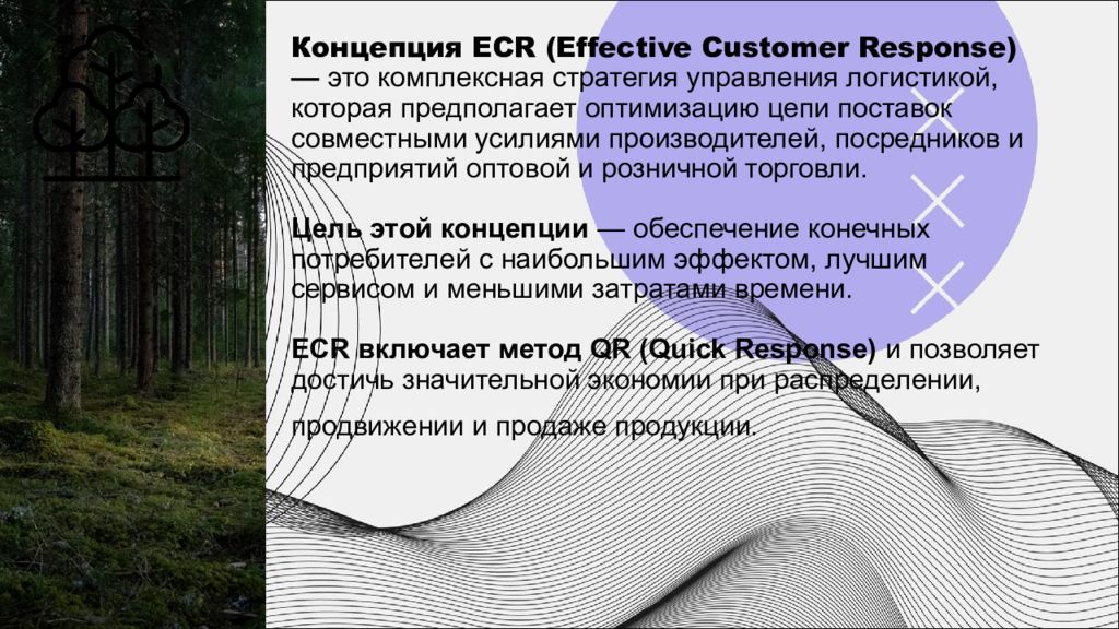Слайд 2: Концепция ECR (Effective Customer Response) — это комплексная стратегия управления логистикой, которая предполагает оптимизацию цепи поставок совместными усилиями производителей, посредников и предприятий оптовой и розничной торговли. Цель этой концепции — обеспечение конечных потребителей с наибольшим эффектом, лучшим сервисом и меньшими затратами времени. ECR включает метод QR (Quick Response) и позволяет достичь значительной экономии при распределении, продвижении и продаже продукции