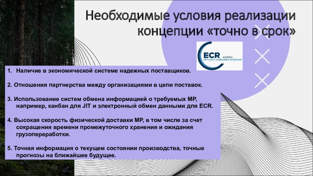 Наличие в экономической системе надежных поставщиков. 2. Отношения партнерства между организациями в цепи поставок. 3. Использование систем обмена информацией о требуемых МР, например, канбан для JIT и электронный обмен данными для ECR. 4. Высокая скорость физической доставки МР, в том числе за счет сокращения времени промежуточного хранения и ожидания грузопереработки. 5. Точная информация о текущем состоянии производства, точные прогнозы на ближайшее будущее.