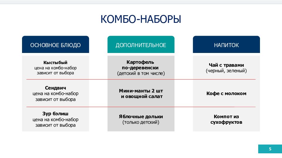 КОМБО-НАБОРЫ 5 ОСНОВНОЕ БЛЮДО ДОПОЛНИТЕЛЬНОЕ НАПИТОК Кыстыбый цена на комбо -набор зависит от выбора Сендвич цена на комбо -набор зависит от выбора Зур бэлиш цена на комбо -набор зависит от выбора Картофель по-деревенски (детский в том числе) Мини-манты 2 шт и овощной салат Яблочные дольки (только детский) Чай с травами (черный, зеленый) Кофе с молоком Компот из сухофруктов