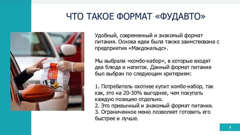 ЧТО ТАКОЕ ФОРМАТ «ФУДАВТО» 3 Удобный, современный и знакомый формат питания. Основа идеи была также заимствована с предприятия «Макдональдс». Мы выбрали « комбо -набор», в которые входят два блюда и напиток. Данный формат питания был выбран по следующим критериям: 1. Потребитель охотнее купит комбо -набор, так как, это на 20-30% выгоднее, чем покупать каждую позицию отдельно. 2. Это привычный и знакомый формат питания. 3. Ограниченное меню позволяет готовить его быстрее и лучше.
