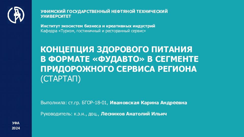 Концепция здорового питания в формате « фудавто » в сегменте придорожного сервиса Региона (СТАРТАП) Выполнила: ст.гр. БГОР-18-01, Ивановская Карина Андреевна Руководитель: к.э.н., доц., Лесников Анатолий Ильич УФИМСКИЙ ГОСУДАРСТВЕННЫЙ НЕФТЯНОЙ ТЕХНИЧЕСКИЙ УНИВЕРСИТЕТ Институт экосистем бизнеса и креативных индустрий Кафедра «Туризм, гостиничный и ресторанный сервис» УФА 2024