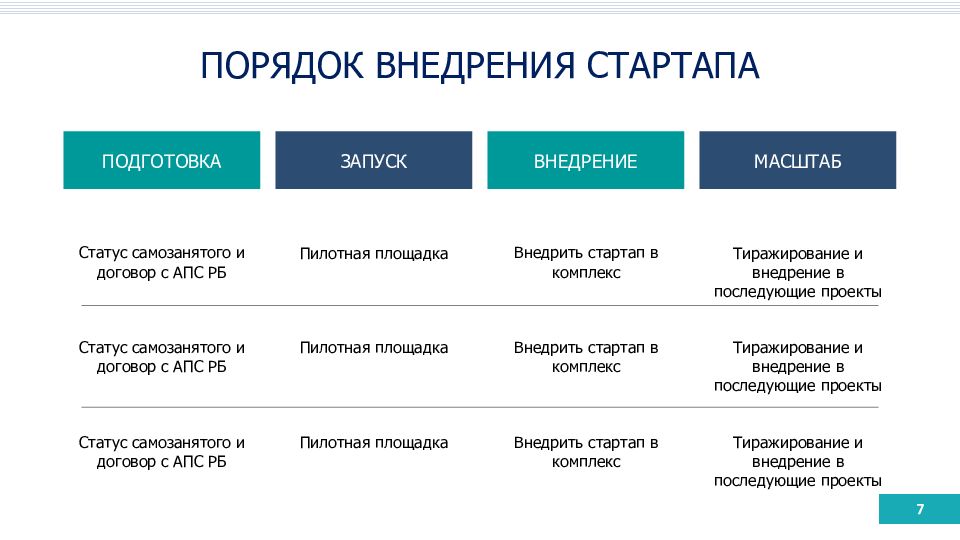 7 ПОДГОТОВКА ЗАПУСК ВНЕДРЕНИЕ МАСШТАБ Статус самозанятого и договор с АПС РБ Статус самозанятого и договор с АПС РБ Статус самозанятого и договор с АПС РБ Пилотная площадка Пилотная площадка Пилотная площадка Внедрить стартап в комплекс Внедрить стартап в комплекс Внедрить стартап в комплекс Тиражирование и внедрение в последующие проекты Тиражирование и внедрение в последующие проекты Тиражирование и внедрение в последующие проекты ПОРЯДОК ВНЕДРЕНИЯ СТАРТАПА 7