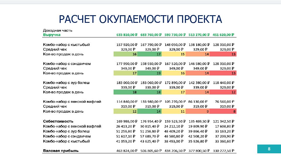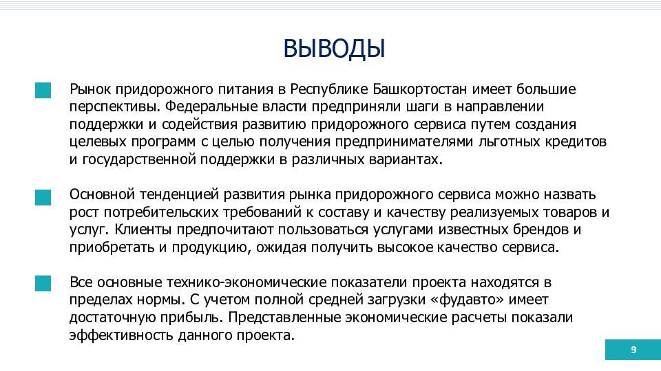9 ВЫВОДЫ Рынок придорожного питания в Республике Башкортостан имеет большие перспективы. Федеральные власти предприняли шаги в направлении поддержки и содействия развитию придорожного сервиса путем создания целевых программ с целью получения предпринимателями льготных кредитов и государственной поддержки в различных вариантах. Основной тенденцией развития рынка придорожного сервиса можно назвать рост потребительских требований к составу и качеству реализуемых товаров и услуг. Клиенты предпочитают пользоваться услугами известных брендов и приобретать и продукцию, ожидая получить высокое качество сервиса. Все основные технико-экономические показатели проекта находятся в пределах нормы. С учетом полной средней загрузки « фудавто » имеет достаточную прибыль. Представленные экономические расчеты показали эффективность данного проекта.