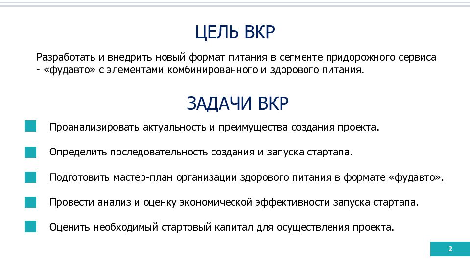 ЦЕЛЬ ВКР 2 Разработать и внедрить новый формат питания в сегменте придорожного сервиса - « фудавто » с элементами комбинированного и здорового питания. ЗАДАЧИ ВКР Проанализировать актуальность и преимущества создания проекта. Определить последовательность создания и запуска стартапа. Подготовить мастер-план организации здорового питания в формате « фудавто ». Провести анализ и оценку экономической эффективности запуска стартапа. Оценить необходимый стартовый капитал для осуществления проекта.