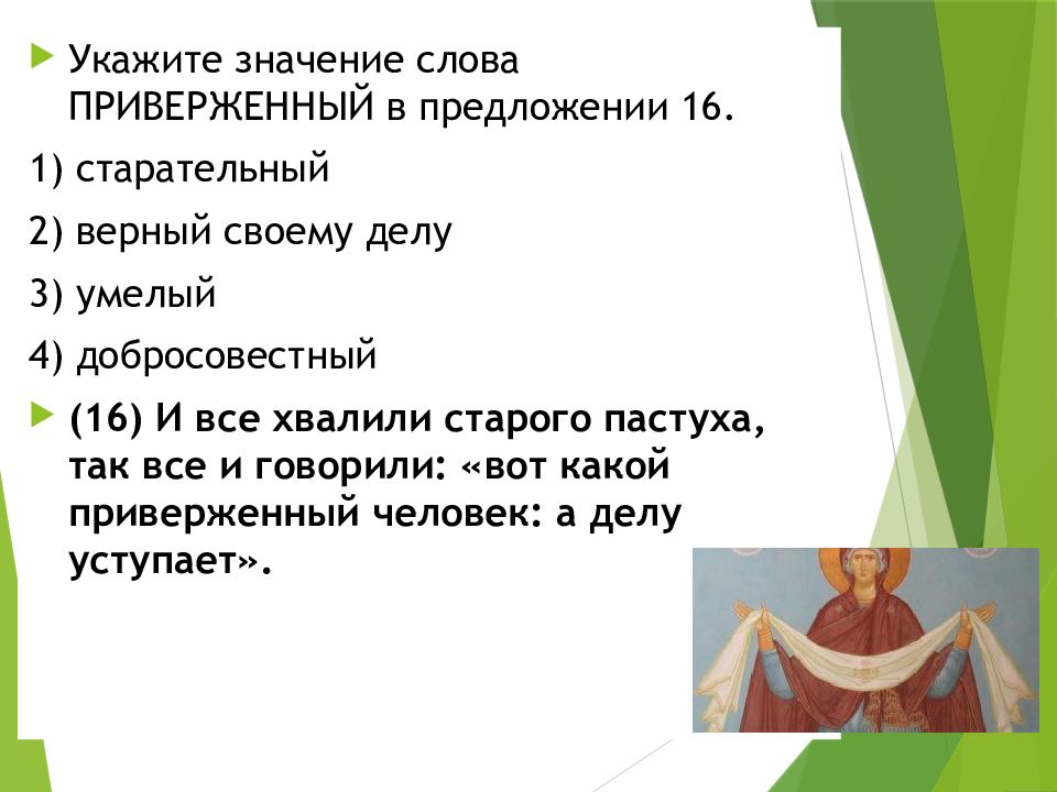 Укажите значение слова ПРИВЕРЖЕННЫЙ в предложении 16. 1) старательный 2) верный своему делу 3) умелый 4) добросовестный (16) И все хвалили старого пастуха, так все и говорили: «вот какой приверженный человек: а делу уступает».
