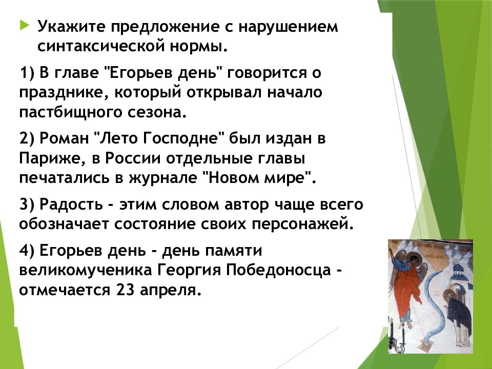 Укажите предложение с нарушением синтаксической нормы. 1) В главе "Егорьев день" говорится о празднике, который открывал начало пастбищного сезона. 2) Роман "Лето Господне" был издан в Париже, в России отдельные главы печатались в журнале "Новом мире". 3) Радость - этим словом автор чаще всего обозначает состояние своих персонажей. 4) Егорьев день - день памяти великомученика Георгия Победоносца - отмечается 23 апреля.