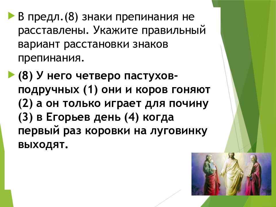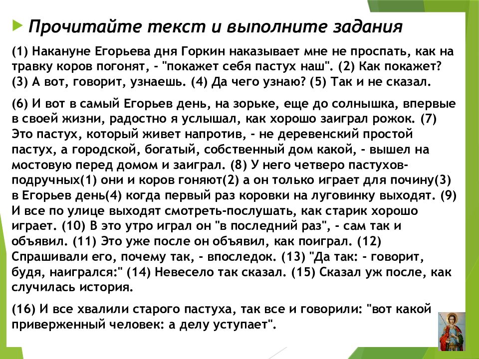 Прочитайте текст и выполните задания (1) Накануне Егорьева дня Горкин наказывает мне не проспать, как на травку коров погонят, - "покажет себя пастух наш". (2) Как покажет? (3) А вот, говорит, узнаешь. (4) Да чего узнаю? (5) Так и не сказал. (6) И вот в самый Егорьев день, на зорьке, еще до солнышка, впервые в своей жизни, радостно я услышал, как хорошо заиграл рожок. (7) Это пастух, который живет напротив, - не деревенский простой пастух, а городской, богатый, собственный дом какой, - вышел на мостовую перед домом и заиграл. (8) У него четверо пастухов-подручных(1) они и коров гоняют(2) а он только играет для почину(3) в Егорьев день(4) когда первый раз коровки на луговинку выходят. (9) И все по улице выходят смотреть-послушать, как старик хорошо играет. (10) В это утро играл он "в последний раз", - сам так и объявил. (11) Это уже после он объявил, как поиграл. (12) Спрашивали его, почему так, - впоследок. (13) "Да так: - говорит, будя, наигрался:" (14) Невесело так сказал. (15) Сказал уж после, как случилась история. (16) И все хвалили старого пастуха, так все и говорили: "вот какой приверженный человек: а делу уступает".