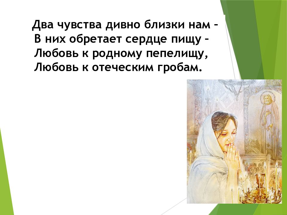 Два чувства дивно близки нам – В них обретает сердце пищу – Любовь к родному пепелищу, Любовь к отеческим гробам.