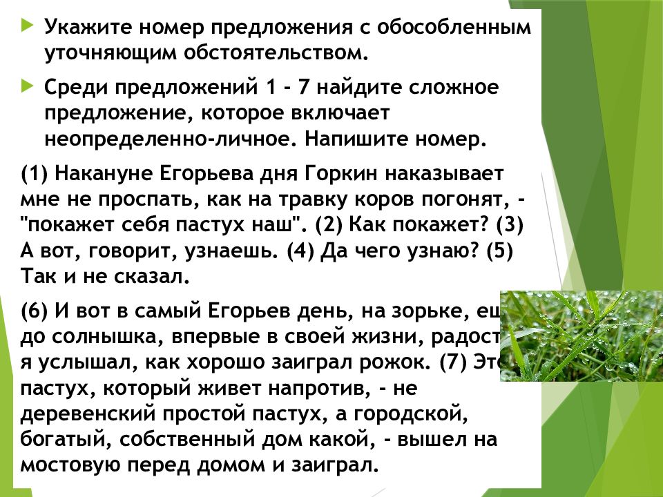 Укажите номер предложения с обособленным уточняющим обстоятельством. Среди предложений 1 - 7 найдите сложное предложение, которое включает неопределенно-личное. Напишите номер. (1) Накануне Егорьева дня Горкин наказывает мне не проспать, как на травку коров погонят, - "покажет себя пастух наш". (2) Как покажет? (3) А вот, говорит, узнаешь. (4) Да чего узнаю? (5) Так и не сказал. (6) И вот в самый Егорьев день, на зорьке, еще до солнышка, впервые в своей жизни, радостно я услышал, как хорошо заиграл рожок. (7) Это пастух, который живет напротив, - не деревенский простой пастух, а городской, богатый, собственный дом какой, - вышел на мостовую перед домом и заиграл.
