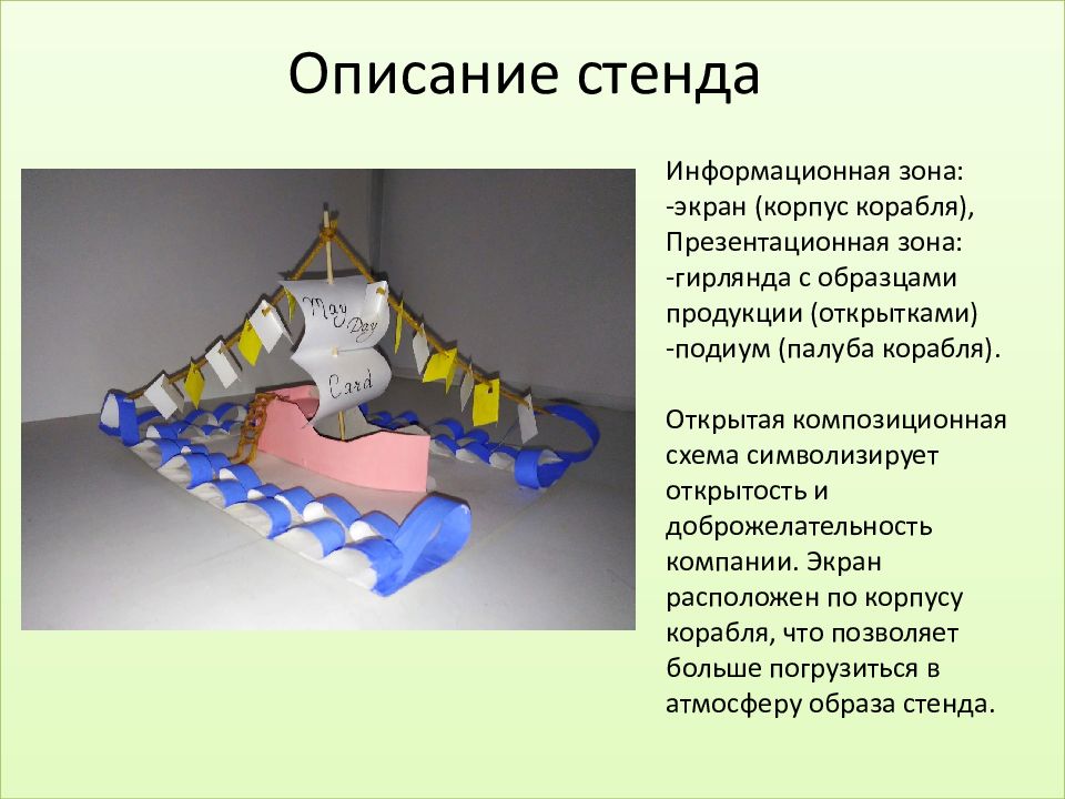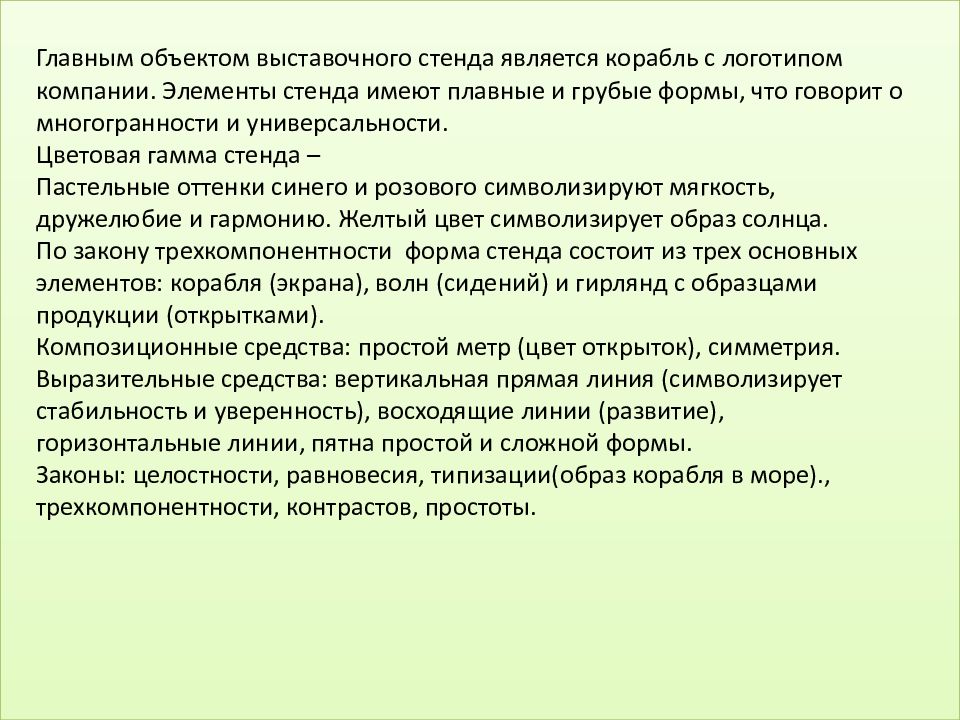 Главным объектом выставочного стенда является корабль с логотипом компании. Элементы стенда имеют плавные и грубые формы, что говорит о многогранности и универсальности. Цветовая гамма стенда – Пастельные оттенки синего и розового символизируют мягкость, дружелюбие и гармонию. Желтый цвет символизирует образ солнца. По закону трехкомпонентности форма стенда состоит из трех основных элементов: корабля (экрана), волн (сидений) и гирлянд с образцами продукции (открытками). Композиционные средства: простой метр (цвет открыток), симметрия. Выразительные средства: вертикальная прямая линия (символизирует стабильность и уверенность), восходящие линии (развитие), горизонтальные линии, пятна простой и сложной формы. Законы: целостности, равновесия, типизации(образ корабля в море)., трехкомпонентности, контрастов, простоты.