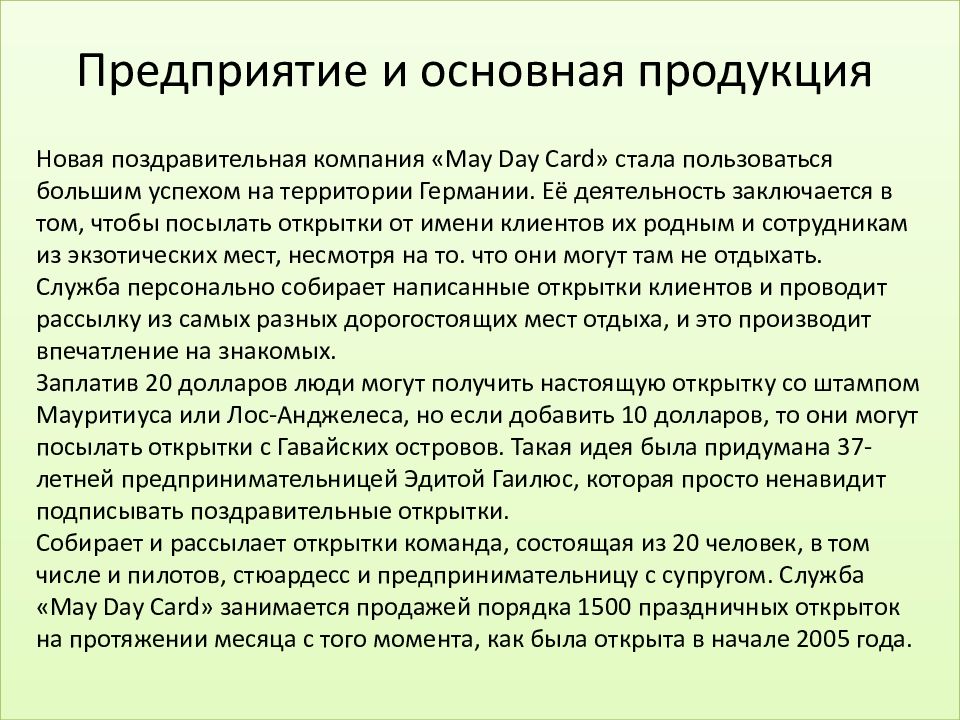 Новая поздравительная компания « May Day Card » стала пользоваться большим успехом на территории Германии. Её деятельность заключается в том, чтобы посылать открытки от имени клиентов их родным и сотрудникам из экзотических мест, несмотря на то. что они могут там не отдыхать. Служба персонально собирает написанные открытки клиентов и проводит рассылку из самых разных дорогостоящих мест отдыха, и это производит впечатление на знакомых. Заплатив 20 долларов люди могут получить настоящую открытку со штампом Мауритиуса или Лос-Анджелеса, но если добавить 10 долларов, то они могут посылать открытки с Гавайских островов. Такая идея была придумана 37-летней предпринимательницей Эдитой Гаилюс, которая просто ненавидит подписывать поздравительные открытки. Собирает и рассылает открытки команда, состоящая из 20 человек, в том числе и пилотов, стюардесс и предпринимательницу с супругом. Служба « May Day Card » занимается продажей порядка 1500 праздничных открыток на протяжении месяца с того момента, как была открыта в начале 2005 года.
