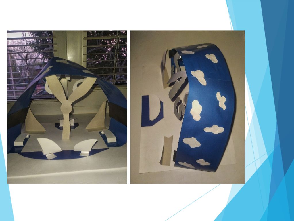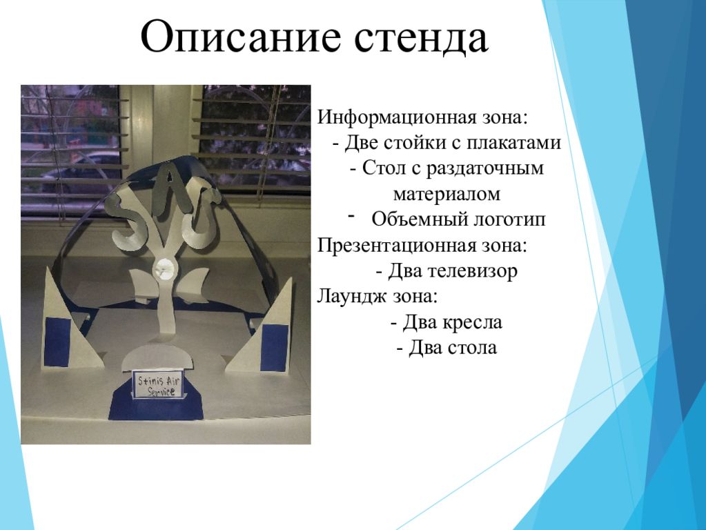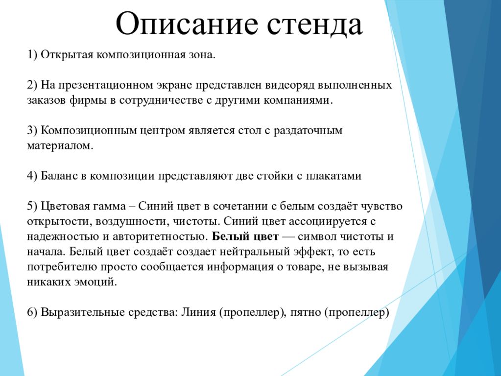Описание стенда 1) Открытая композиционная зона. 2) На презентационном экране представлен видеоряд выполненных заказов фирмы в сотрудничестве с другими компаниями. 3) Композиционным центром является стол с раздаточным материалом. 4) Баланс в композиции представляют две стойки с плакатами 5) Цветовая гамма – Синий цвет в сочетании с белым создаёт чувство открытости, воздушности, чистоты. Синий цвет ассоциируется с надежностью и авторитетностью. Белый цвет — символ чистоты и начала. Белый цвет создаёт создает нейтральный эффект, то есть потребителю просто сообщается информация о товаре, не вызывая никаких эмоций. 6) Выразительные средства: Линия (пропеллер), пятно (пропеллер)
