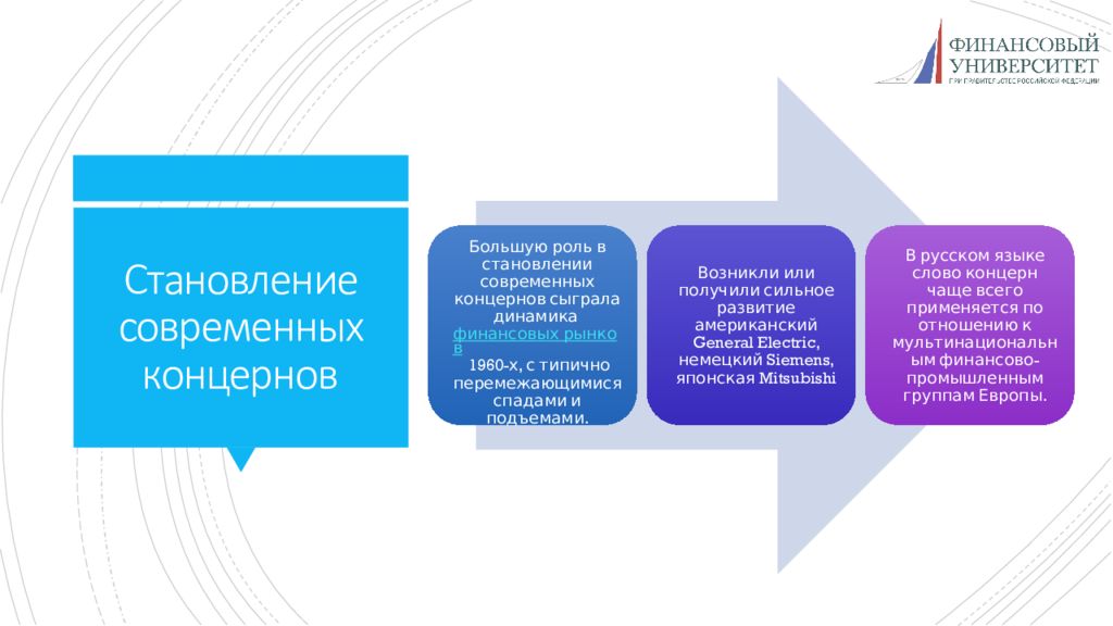 Термин «концерн» заимствован из немецкого языка (куда пришел из английского, а начало берет от лат. « concernere » — смешивать) и тесно связан с историей развития экономики Германии и особенностями немецкого законо - дательства. Первый концерн в мире и прообраз будущих конгломератов создал во Флоренции К.Медичи. Само понятие концерна возникло только через несколько сотен лет.