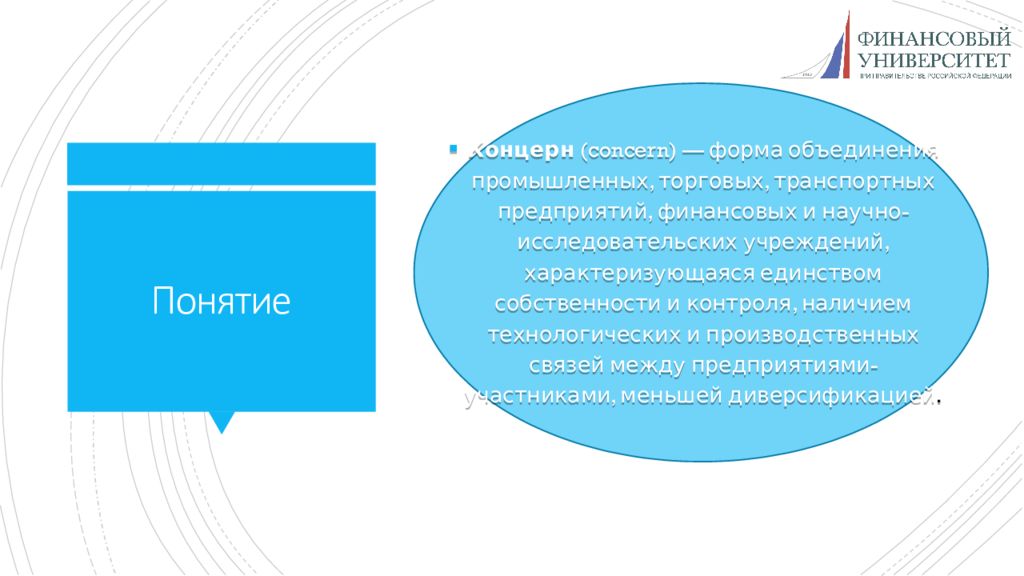 Концерн ( concern ) — форма объединения промышленных, торговых, транспортных предприятий, финансовых и научно-исследовательских учреждений, характеризующаяся единством собственности и контроля, наличием технологических и производственных связей между предприятиями-участниками, меньшей диверсификацией.