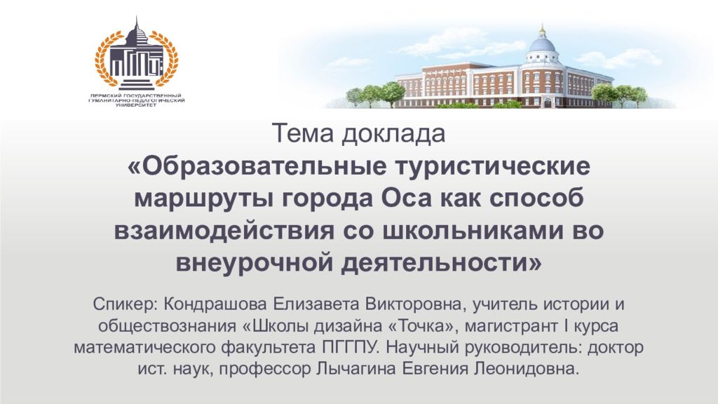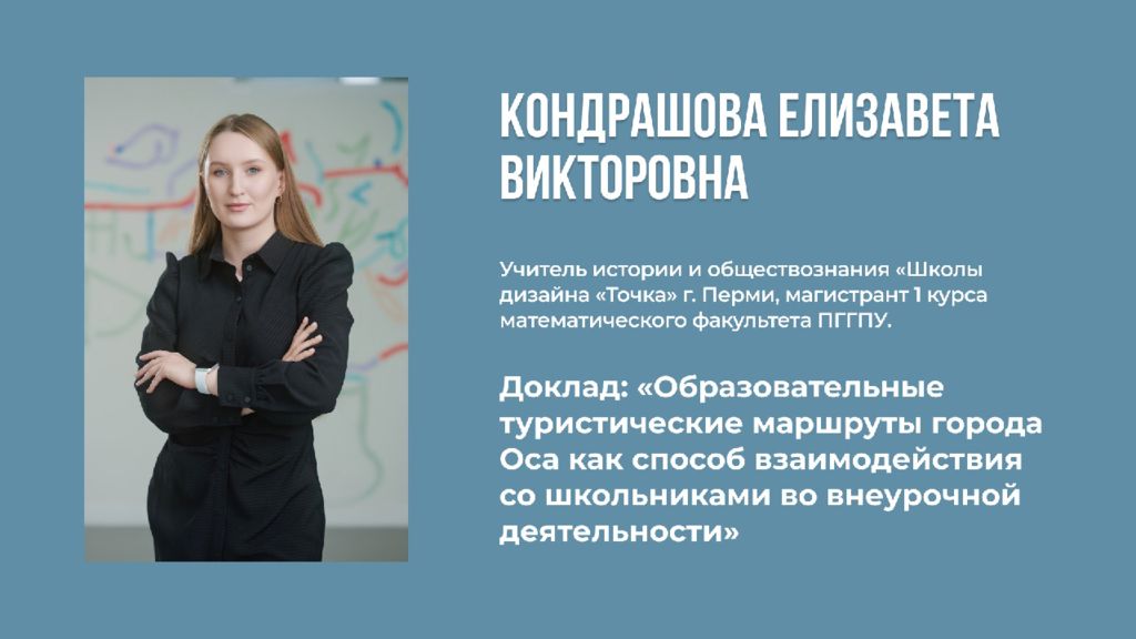 Спикер: Кондрашова Елизавета Викторовна, учитель истории и обществознания «Школы дизайна «Точка», магистрант I курса математического факультета ПГГПУ. Научный руководитель: доктор ист. наук, профессор Лычагина Евгения Леонидовна.