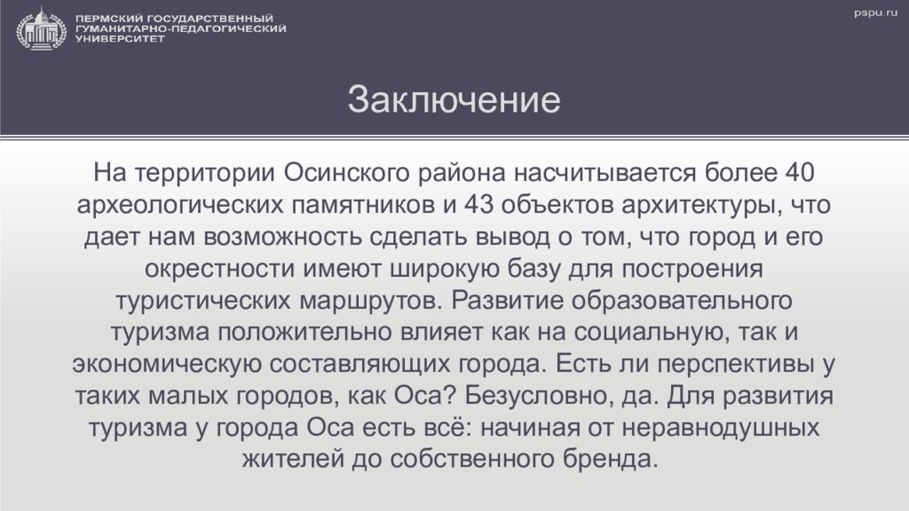 На территории Осинского района насчитывается более 40 археологических памятников и 43 объектов архитектуры, что дает нам возможность сделать вывод о том, что город и его окрестности имеют широкую базу для построения туристических маршрутов. Развитие образовательного туризма положительно влияет как на социальную, так и экономическую составляющих города. Есть ли перспективы у таких малых городов, как Оса? Безусловно, да. Для развития туризма у города Оса есть всё: начиная от неравнодушных жителей до собственного бренда.