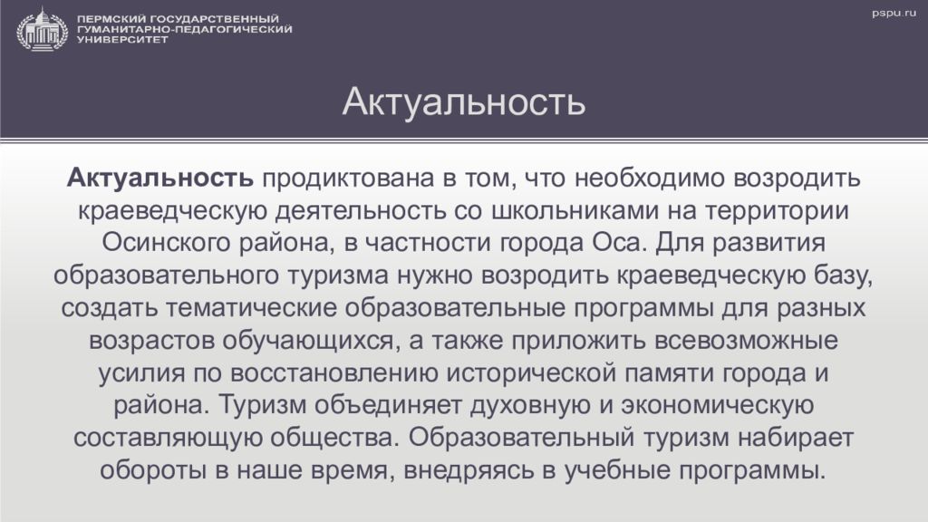 Актуальность продиктована в том, что необходимо возродить краеведческую деятельность со школьниками на территории Осинского района, в частности города Оса. Для развития образовательного туризма нужно возродить краеведческую базу, создать тематические образовательные программы для разных возрастов обучающихся, а также приложить всевозможные усилия по восстановлению исторической памяти города и района. Туризм объединяет духовную и экономическую составляющую общества. Образовательный туризм набирает обороты в наше время, внедряясь в учебные программы.