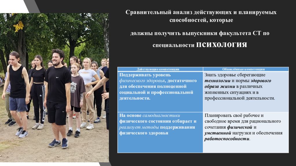 Действующие компетенции Обновлённые компетенции Поддерживать уровень физического здоровья, достаточного для обеспечения полноценной социальной и профессиональной деятельности. Знать здоровье сберегающие технологии и нормы здорового образа жизни в различных жизненных ситуациях и в профессиональной деятельности. На основе самодиагностики физического состояния отбирает и реализует методы поддерживания физического здоровья Планировать своё рабочее и свободное время для рационального сочетания физической и умственной нагрузки и обеспечения работоспособности. Сравнительный анализ действующих и планируемых способностей, которые