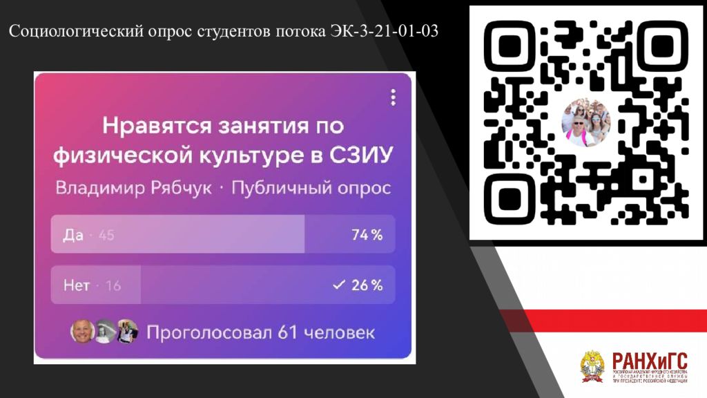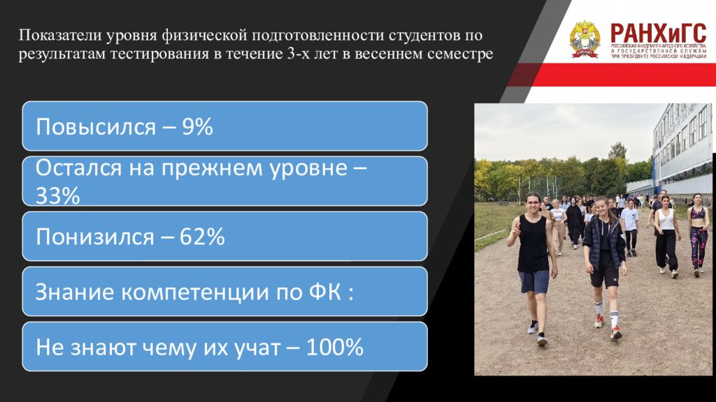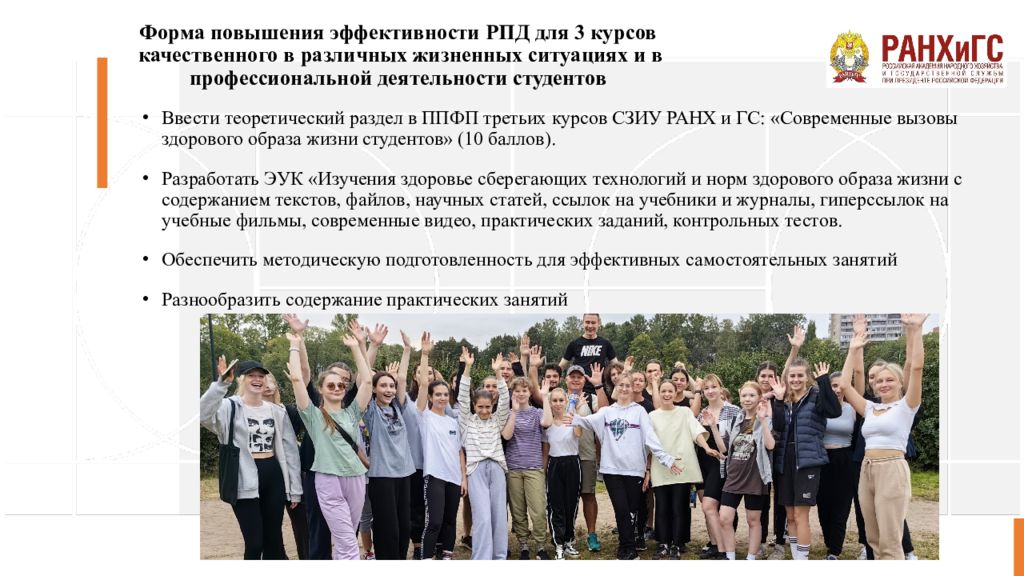 Ввести теоретический раздел в ППФП третьих курсов СЗИУ РАНХ и ГС: «Современные вызовы здорового образа жизни студентов» (10 баллов). Разработать ЭУК «И зучения здоровье сберегающих технологий и норм здорового образа жизни с содержанием текстов, файлов, научных статей, ссылок на учебники и журналы, гиперссылок на учебные фильмы, современные видео, практических заданий, контрольных тестов. Обеспечить методическую подготовленность для эффективных самостоятельных занятий Разнообразить содержание практических занятий