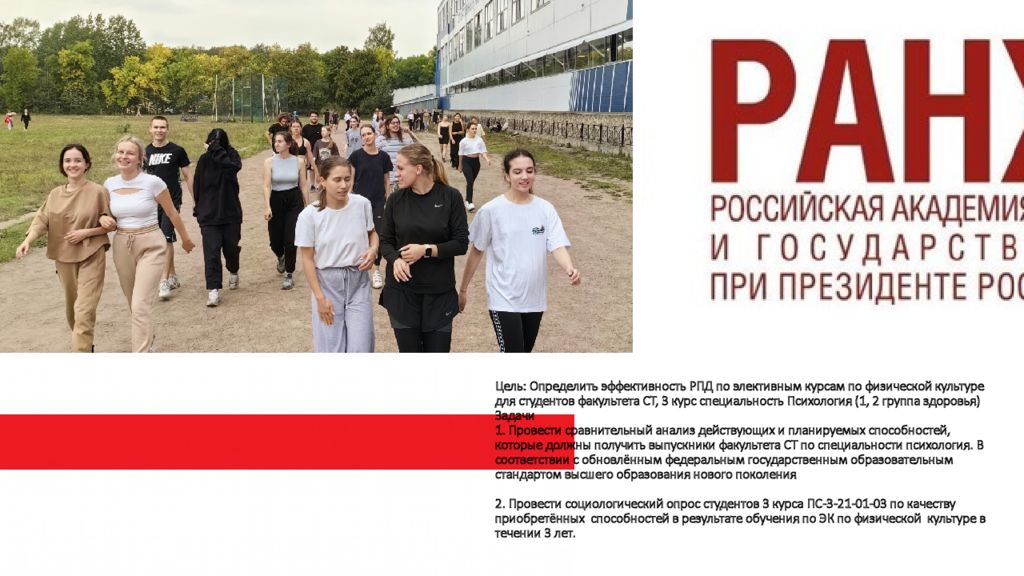 Слайд 4: Цель : Определить э ффективность РПД по элективным курсам по физической культуре для студентов факультета СТ, 3 курс специальность Психология (1, 2 группа здоровья ) Задачи 1. Провести сравнительный анализ действующих и планируемых способностей, которые должны получить выпускники факультета СТ по специальности психология. В соответствии с обновлённым федеральным государственным образовательным стандартом высшего образования нового поколения 2. Провести социологический опрос студентов 3 курса ПС-3-21-01-03 по качеству приобретённых способностей в результате обучения по ЭК по физической культуре в течении 3 лет