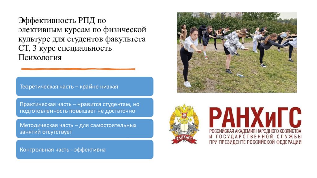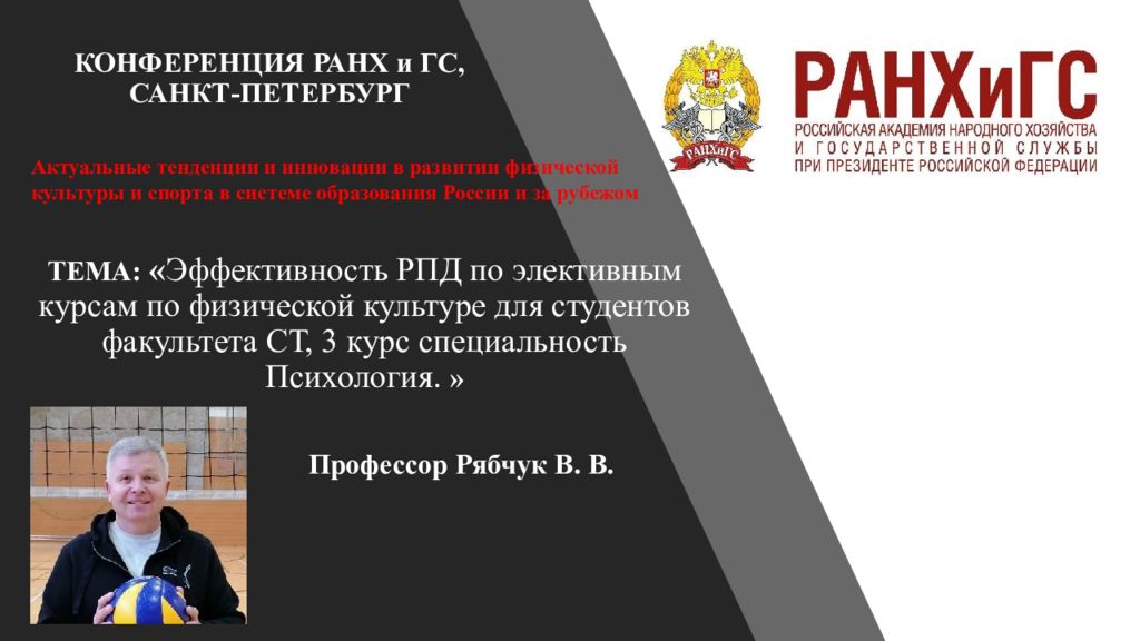 ТЕМА: « Эффективность РПД по элективным курсам по физической культуре для студентов факультета СТ, 3 курс специальность Психология. » Профессор Рябчук В. В. Актуальные тенденции и инновации в развитии физической культуры и спорта в системе образования России и за рубежом