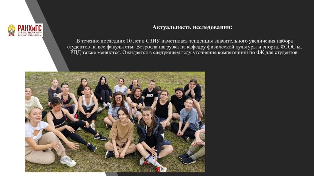 Слайд 2: Актуальность исследования: В течение последних 10 лет в СЗИУ наметилась тенденция значительного увеличения набора студентов на все факультеты. Возросла нагрузка на кафедру физической культуры и спорта. ФГОС ы, РПД также меняются. Ожидается в следующем году уточнение компетенций по ФК для студентов