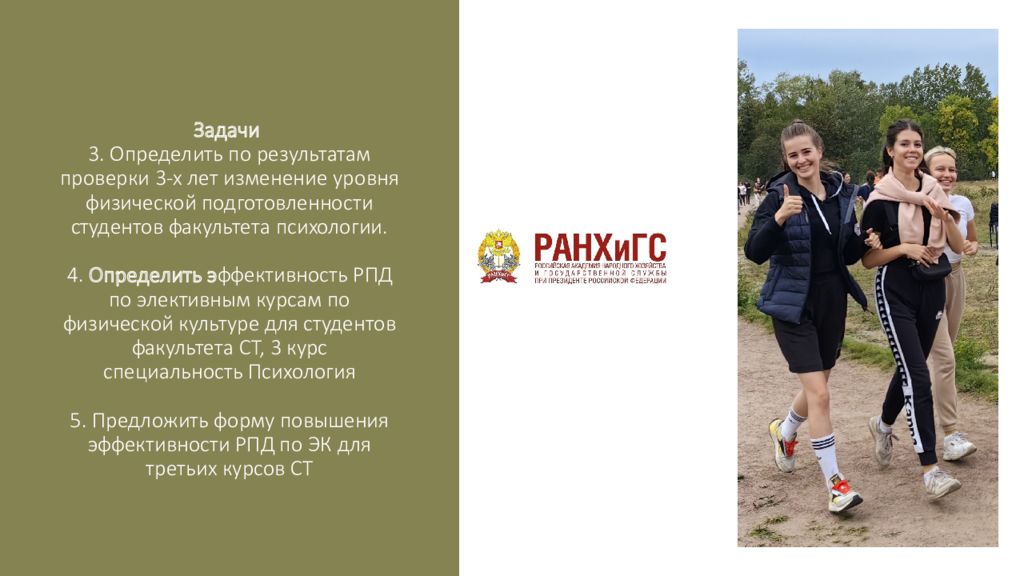 Слайд 5: Задачи 3. Определить по результатам проверки 3-х лет изменение уровня физической подготовленности студентов факультета психологии. 4. Определить э ффективность РПД по элективным курсам по физической культуре для студентов факультета СТ, 3 курс специальность Психология 5. Предложить форму повышения эффективности РПД по ЭК для третьих курсов СТ