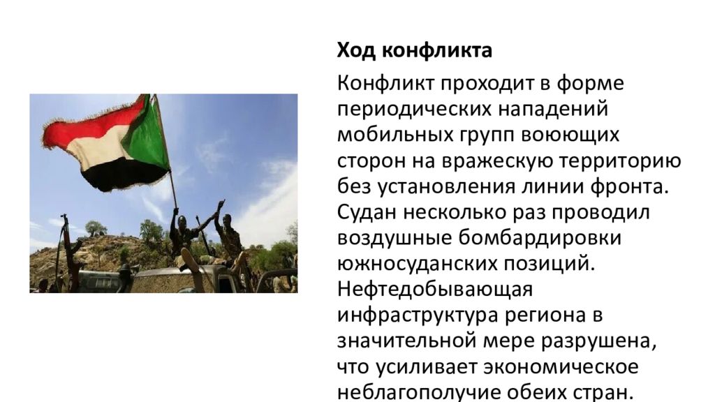 Ход конфликта Конфликт проходит в форме периодических нападений мобильных групп воюющих сторон на вражескую территорию без установления линии фронта. Судан несколько раз проводил воздушные бомбардировки южносуданских позиций. Нефтедобывающая инфраструктура региона в значительной мере разрушена, что усиливает экономическое неблагополучие обеих стран.