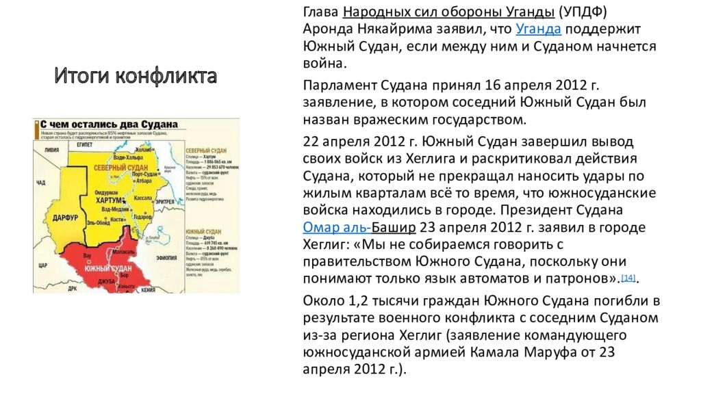 Последний слайд презентации: Конфликт Судана и Южного Судана: Итоги конфликта