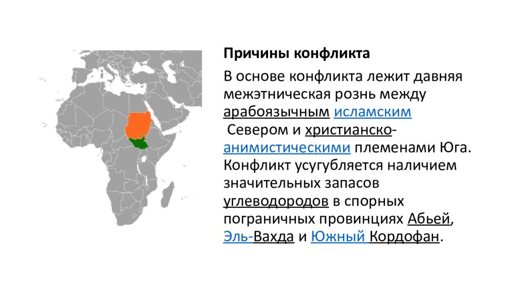 Причины конфликта В основе конфликта лежит давняя межэтническая рознь между арабоязычным исламским Севером и христианско - анимистическими племенами Юга. Конфликт усугубляется наличием значительных запасов углеводородов в спорных пограничных провинциях Абьей, Эль- Вахда и Южный Кордофан.