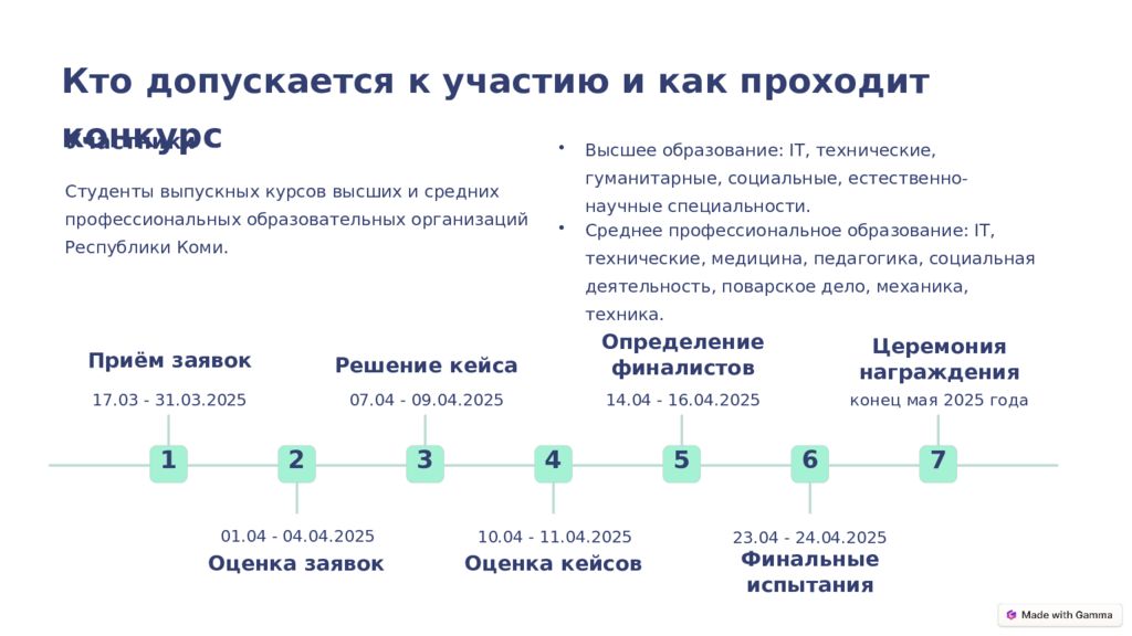 1 Приём заявок 17.03 - 31.03.2025 2 Оценка заявок 01.04 - 04.04.2025 3 Решение кейса 07.04 - 09.04.2025 4 Оценка кейсов 10.04 - 11.04.2025 5 Определение финалистов 14.04 - 16.04.2025 6 Финальные испытания 23.04 - 24.04.2025 7 Церемония награждения конец мая 2025 года Кто допускается к участию и как проходит конкурс Участники Студенты выпускных курсов высших и средних профессиональных образовательных организаций Республики Коми. Высшее образование: IT, технические, гуманитарные, социальные, естественно-научные специальности. Среднее профессиональное образование: IT, технические, медицина, педагогика, социальная деятельность, поварское дело, механика, техника.