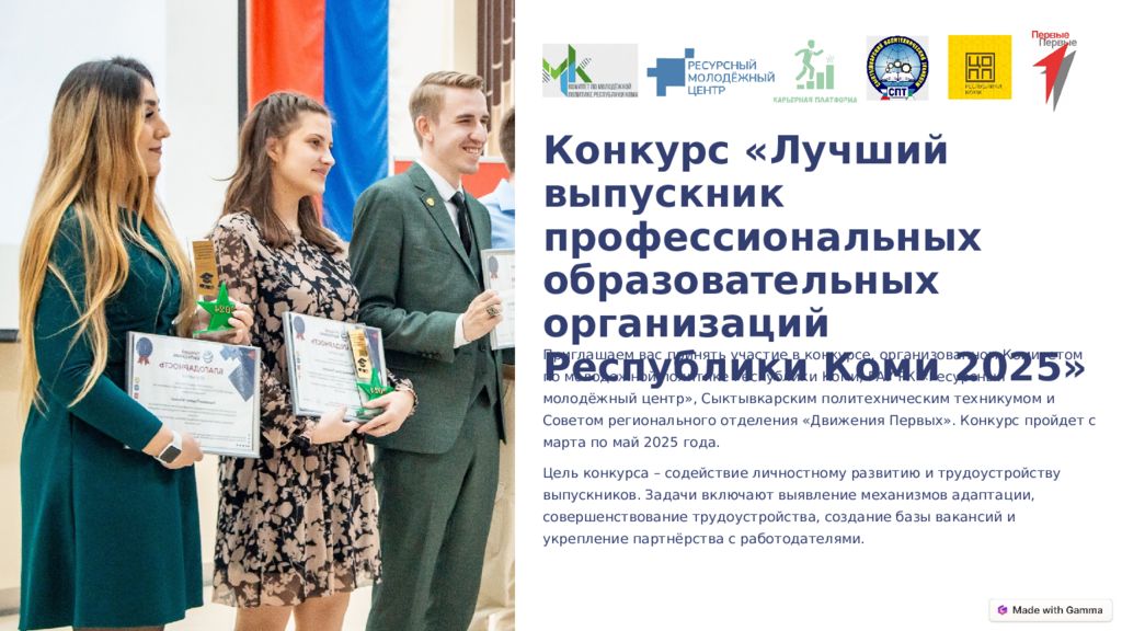 Конкурс «Лучший выпускник профессиональных образовательных организаций Республики Коми 2025» Приглашаем вас принять участие в конкурсе, организованном Комитетом по молодежной политике Республики Коми, ГАУ РК «Ресурсный молодёжный центр», Сыктывкарским политехническим техникумом и Советом регионального отделения «Движения Первых». Конкурс пройдет с марта по май 2025 года. Цель конкурса – содействие личностному развитию и трудоустройству выпускников. Задачи включают выявление механизмов адаптации, совершенствование трудоустройства, создание базы вакансий и укрепление партнёрства с работодателями.
