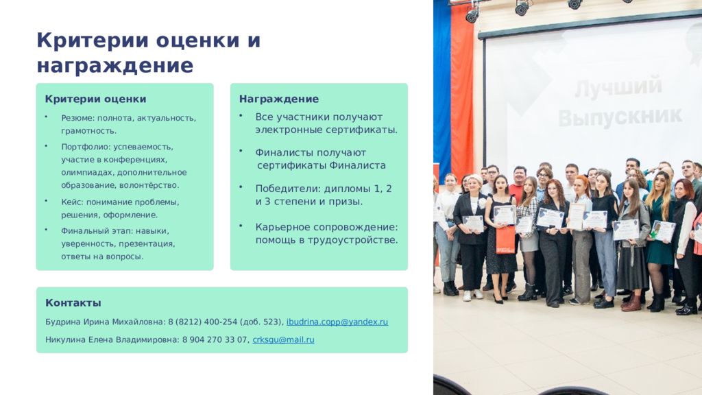 Критерии оценки и награждение Критерии оценки Резюме: полнота, актуальность, грамотность. Портфолио: успеваемость, участие в конференциях, олимпиадах, дополнительное образование, волонтёрство. Кейс: понимание проблемы, решения, оформление. Финальный этап: навыки, уверенность, презентация, ответы на вопросы. Награждение Все участники получают электронные сертификаты. Финалисты получают сертификаты Финалиста Победители: дипломы 1, 2 и 3 степени и призы. Карьерное сопровождение: помощь в трудоустройстве. Контакты Будрина Ирина Михайловна: 8 (8212) 400-254 (доб. 523), ibudrina.copp@yandex.ru Никулина Елена Владимировна: 8 904 270 33 07, crksgu@mail.ru