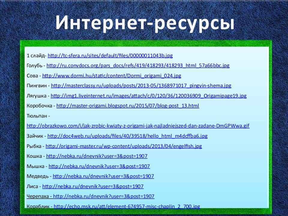 Интернет-ресурсы 1 слайд- http://tc-sfera.ru/sites/default/files/00000011043b.jpg Голубь - http://ru.convdocs.org/pars_docs/refs/419/418293/418293_html_57a66bbc.jpg Сова - http://www.dormi.hu/static/content/Dormi_origami_024.jpg Пингвин - http://masterclassy.ru/uploads/posts/2013-05/1368971017_pingvin-shema.jpg Лягушка - http://img1.liveinternet.ru/images/attach/c/0/120/36/120036909_Origamipage19.jpg Коробочка - http://master-origami.blogspot.ru/2015/07/blog-post_13.html Тюльпан - http://obrazkowo.com/i/jak-zrobic-kwiaty-z-origami-jak-najladniejszed-dan-zadane-DmGPWwa.gif Зайчик - http://doc4web.ru/uploads/files/40/39518/hello_html_m4dcffba6.jpg Рыбка - http://origami-master.ru/wp-content/uploads/2013/04/engelfish.jpg Кошка - http://nebka.ru/dnevnik?user=3&post=1907 Мышка - http://nebka.ru/dnevnik?user=3&post=1907 Медведь - http://nebka.ru/dnevnik?user=3&post=1907 Лиса - http:// nebka.ru/dnevnik?user=3&post=1907 Черепаха - http://nebka.ru/dnevnik?user=3&post=1907 Кораблик - http:// echo.msk.ru/att/element-674957-misc-chaplin_2_700.jpg
