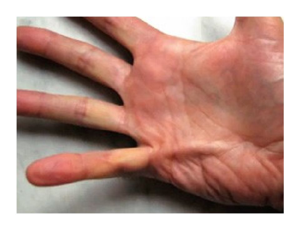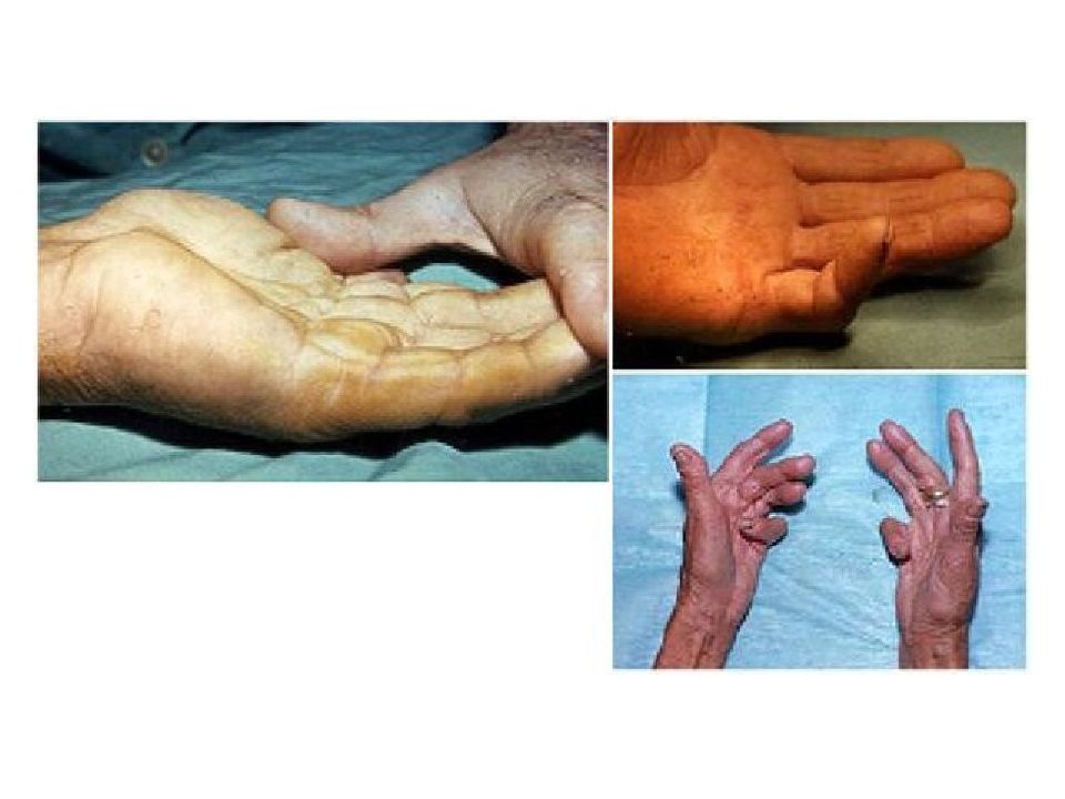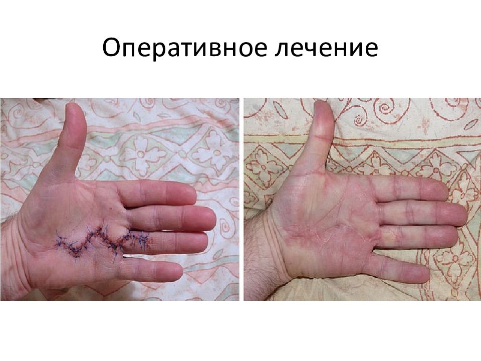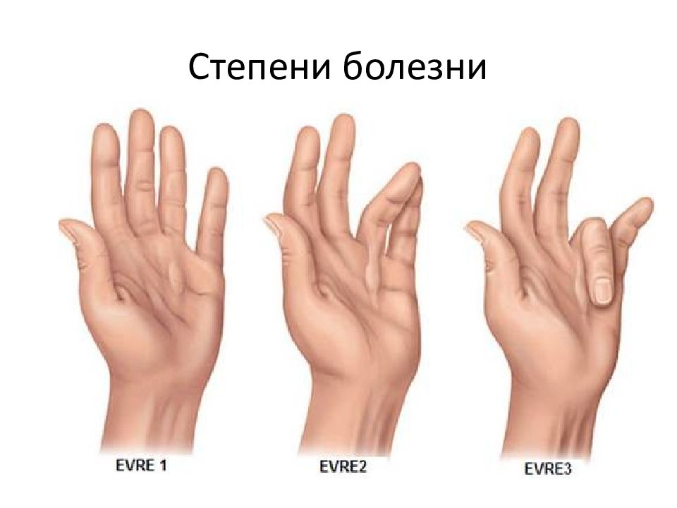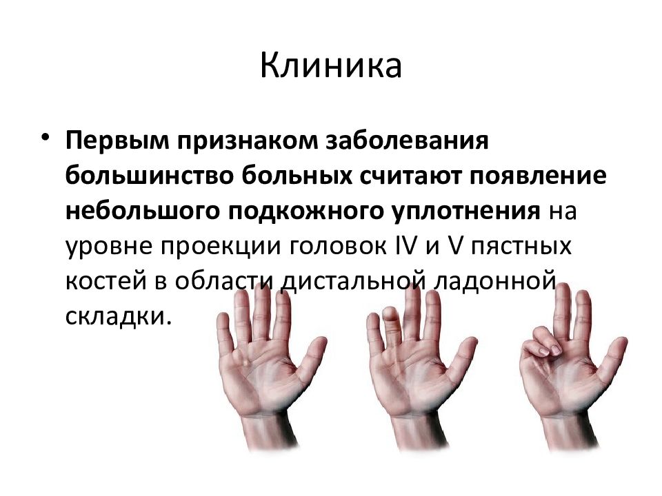 Первым признаком заболевания большинство больных считают появление небольшого подкожного уплотнения на уровне проекции головок IV и V пястных костей в области дистальной ладонной складки.