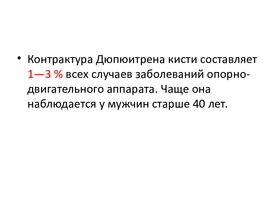 Контрактура Дюпюитрена кисти составляет 1—3 % всех случаев заболеваний опорно-двигательного аппарата. Чаще она наблюдается у мужчин старше 40 лет.