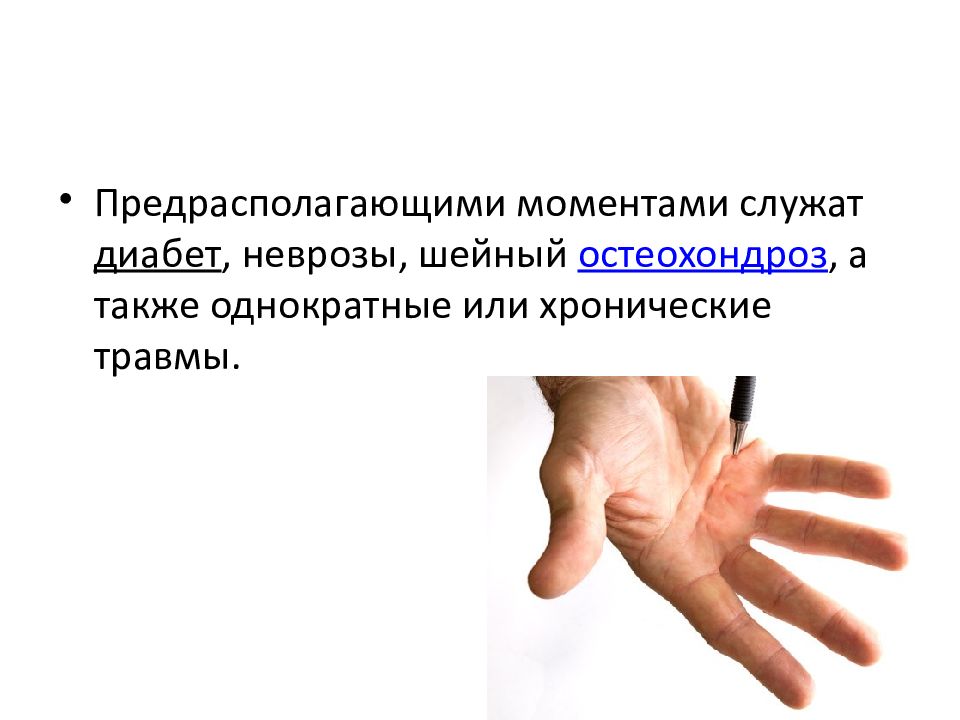 Предрасполагающими моментами служат диабет, неврозы, шейный остеохондроз, а также однократные или хронические травмы.