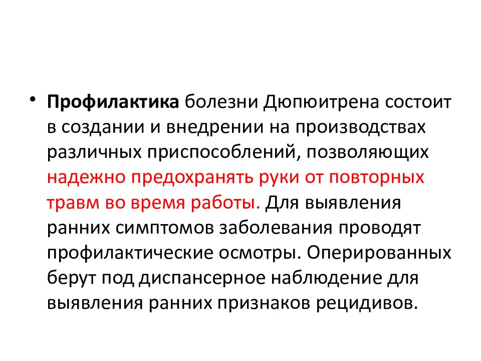 Профилактика болезни Дюпюитрена состоит в создании и внедрении на производствах различных приспособлений, позволяющих надежно предохранять руки от повторных травм во время работы. Для выявления ранних симптомов заболевания проводят профилактические осмотры. Оперированных берут под диспансерное наблюдение для выявления ранних признаков рецидивов.