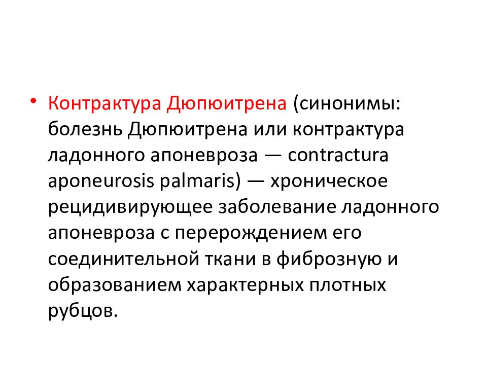 Контрактура Дюпюитрена (синонимы: болезнь Дюпюитрена или контрактура ладонного апоневроза — contractura aponeurosis palmaris) — хроническое рецидивирующее заболевание ладонного апоневроза с перерождением его соединительной ткани в фиброзную и образованием характерных плотных рубцов.