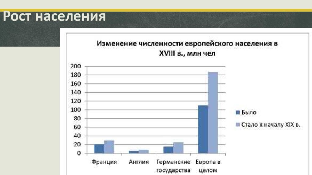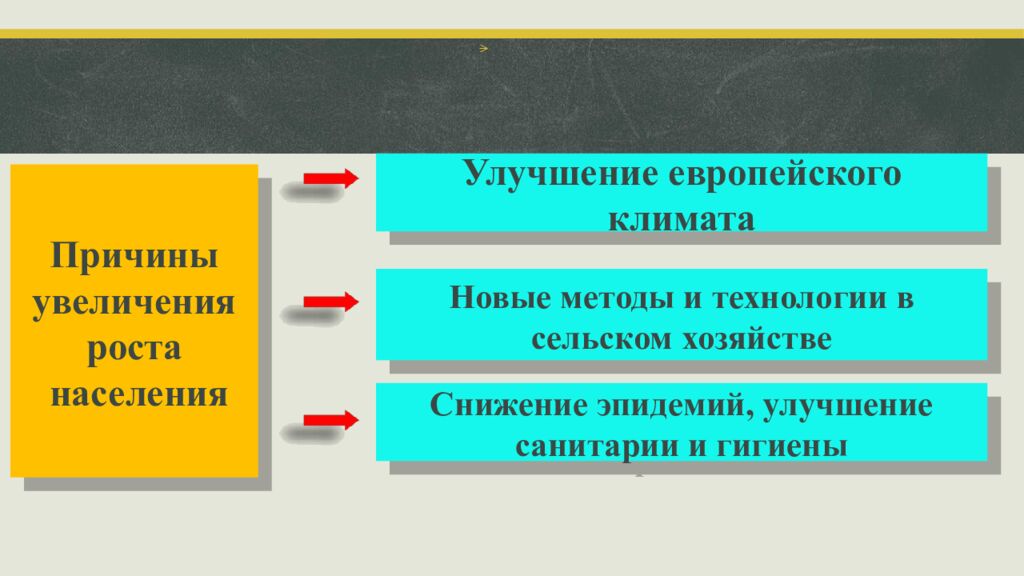 Причины увеличения роста населения Улучшение европейского климата Новые методы и технологии в сельском хозяйстве Снижение эпидемий, улучшение санитарии и гигиены