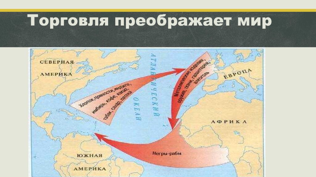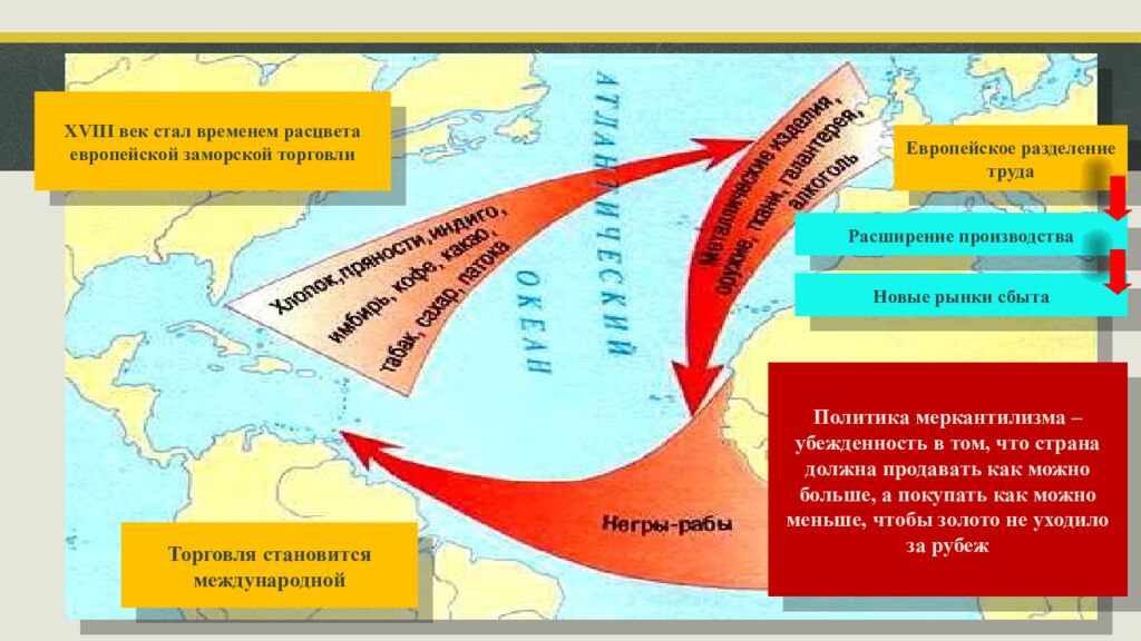 XVIII век стал временем расцвета европейской заморской торговли Европейское разделение труда Расширение производства Новые рынки сбыта Торговля становится международной Политика меркантилизма – убежденность в том, что страна должна продавать как можно больше, а покупать как можно меньше, чтобы золото не уходило за рубеж